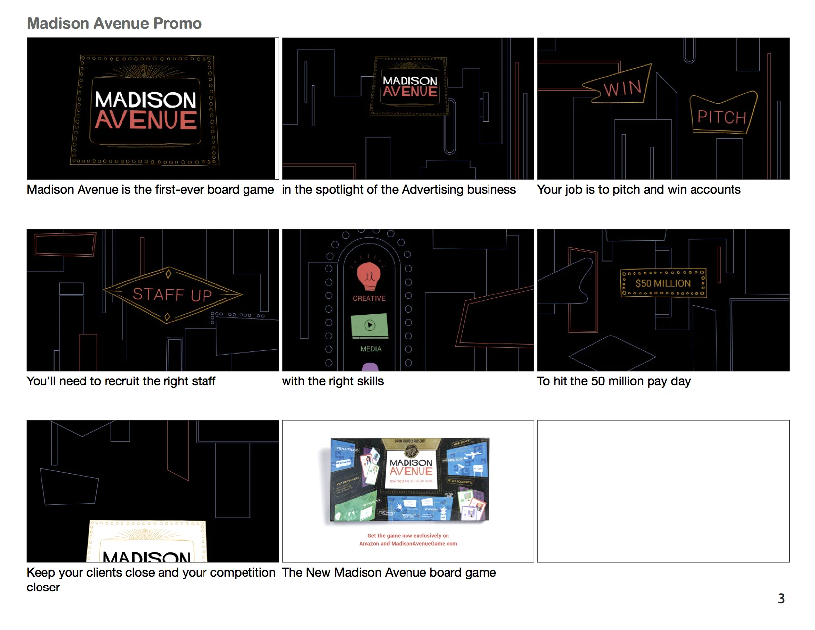 Madison Avenue is the first ever board game based on the advertising industry. Players take on roles as ad agencies, and complete tasks include hiring staff, winning pitches, gaining clients, while dodging all the mishaps that comes along. The visual and typography styles are inspired by 1960s retro graphics. The project includes designs for the game logo, fully illustrated game board and box, 100 individually designed character cards, 50 client cards, 26 nonsense cards, busy boxes, a spinner, and a 10-page rule book. In addition to the physical board game, I also designed and animated a promo video and an explanation video for the game rules.